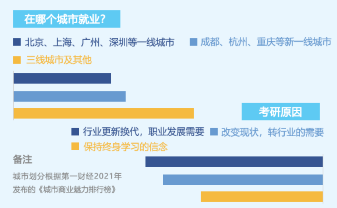 不難看出在職考研考生就業(yè)更多偏向三線城市工作和發(fā)展,在職考研的目的也更多是為了行業(yè)更新?lián)Q代和職業(yè)發(fā)展需要而去備考,所以在職考生有必要認(rèn)清楚自己的考研目的和發(fā)展方向。