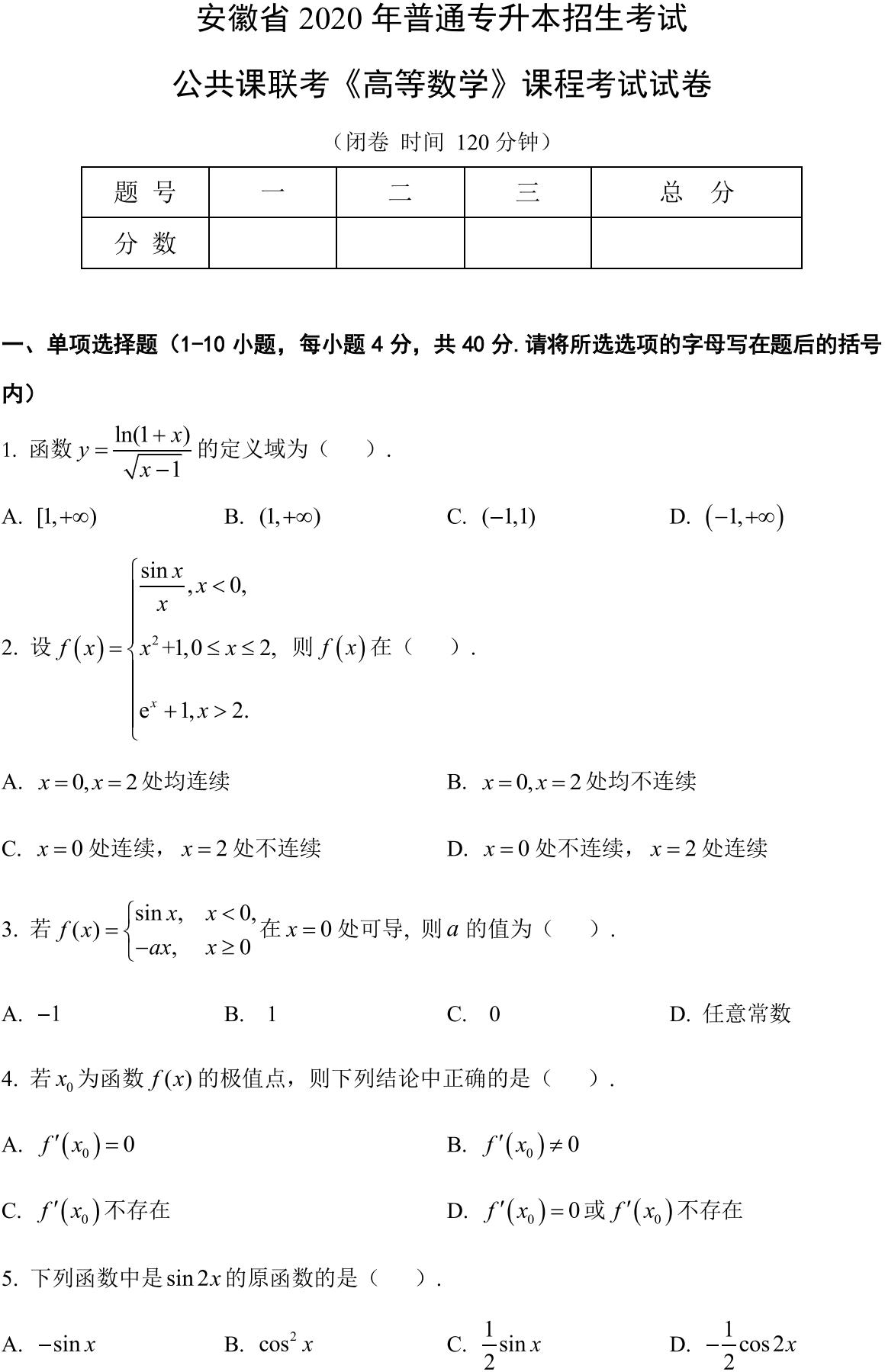 安徽省2020年普通高等學(xué)校專升本招生考試高等數(shù)學(xué)試卷_01