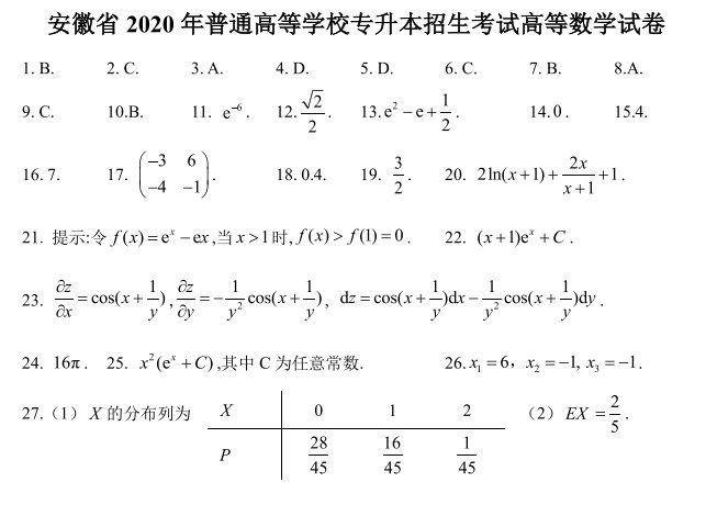 安徽省2020年普通高等學(xué)校專升本招生考試高等數(shù)學(xué)試卷答案