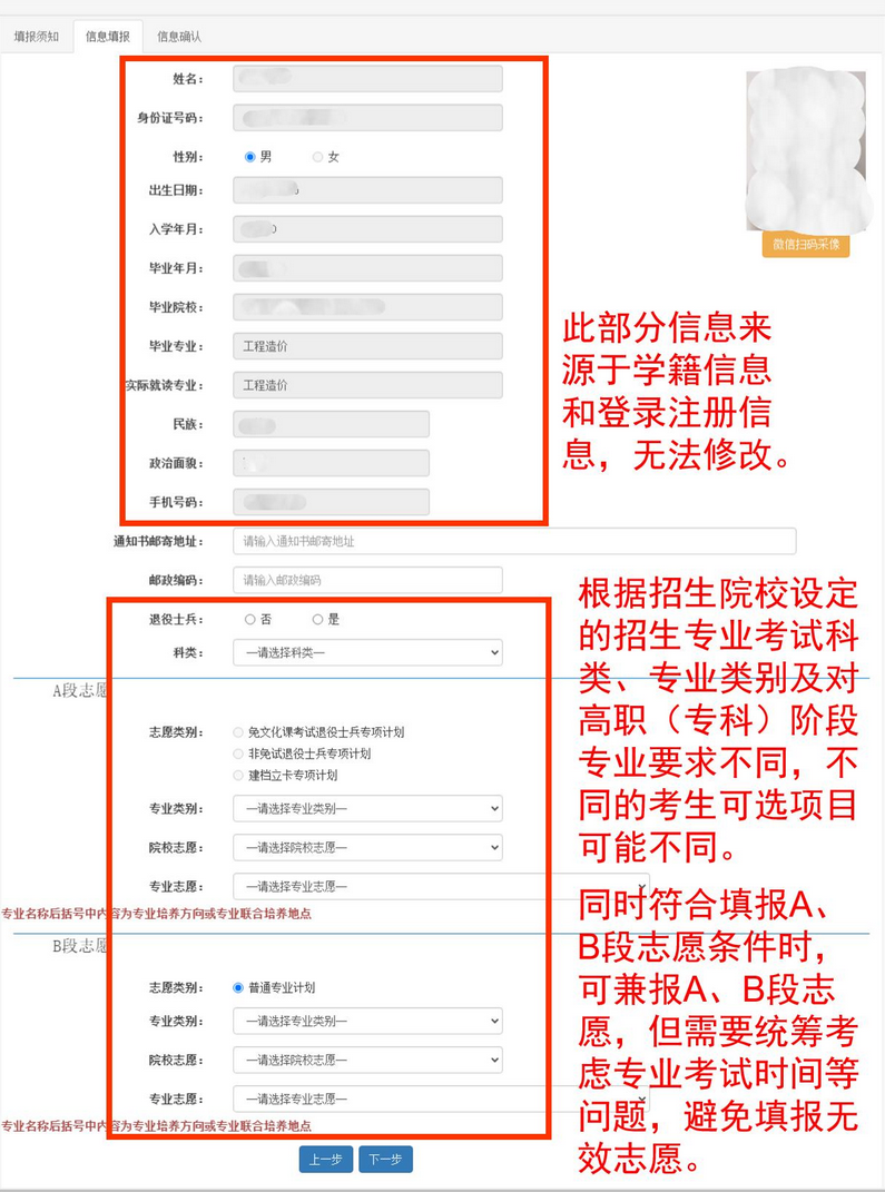 在充分閱讀招生院?!墩猩鲁獭?,了解院校招生要求后,根據(jù)自身情況,填寫郵寄地址、郵政編碼,選擇自己報(bào)考的科類、院校志愿和專業(yè)志愿。