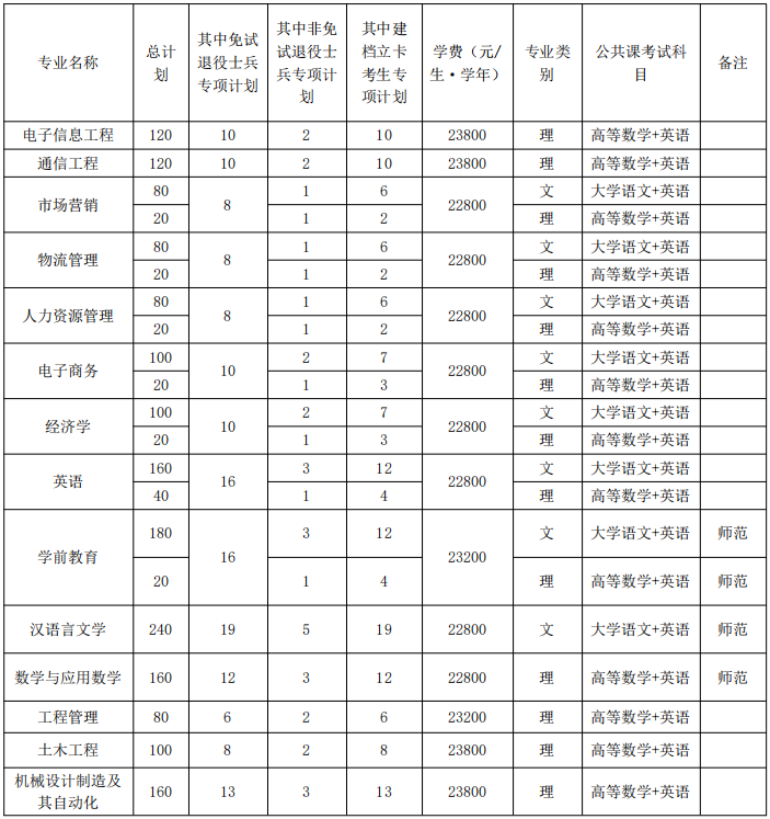 (2)免文化課考試退役士兵專項(xiàng)計(jì)劃文理兼招。