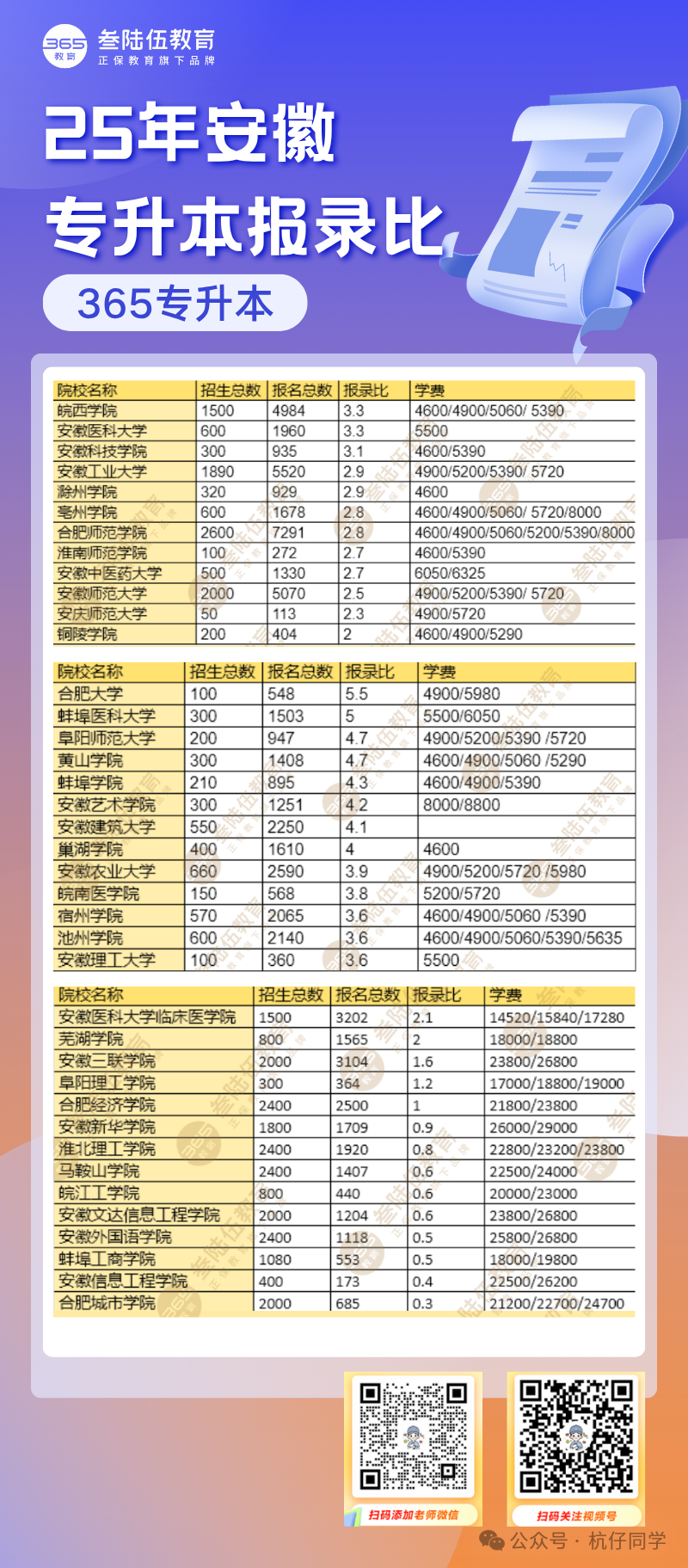 安徽專升本25年報(bào)錄比和學(xué)費(fèi)匯總