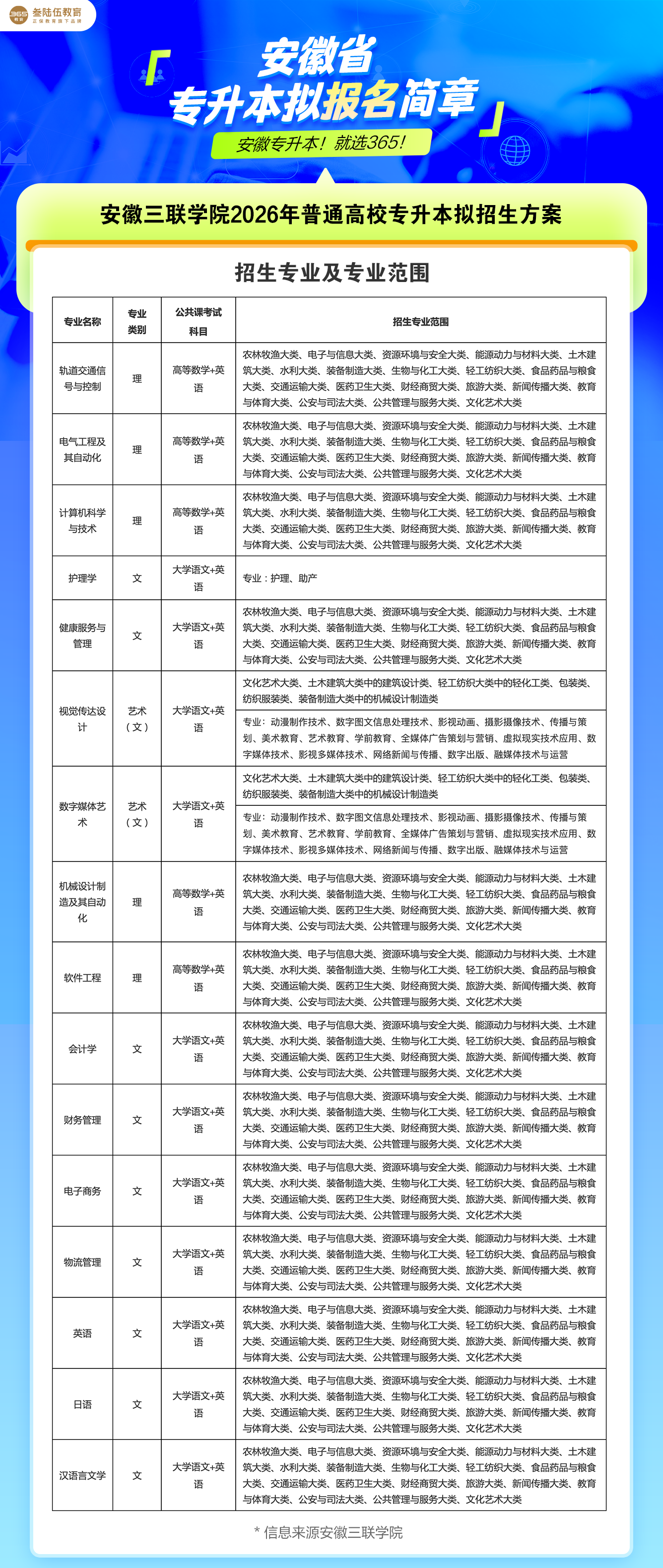 安徽三聯(lián)學院2026年普通高校專升本招生方案(擬)